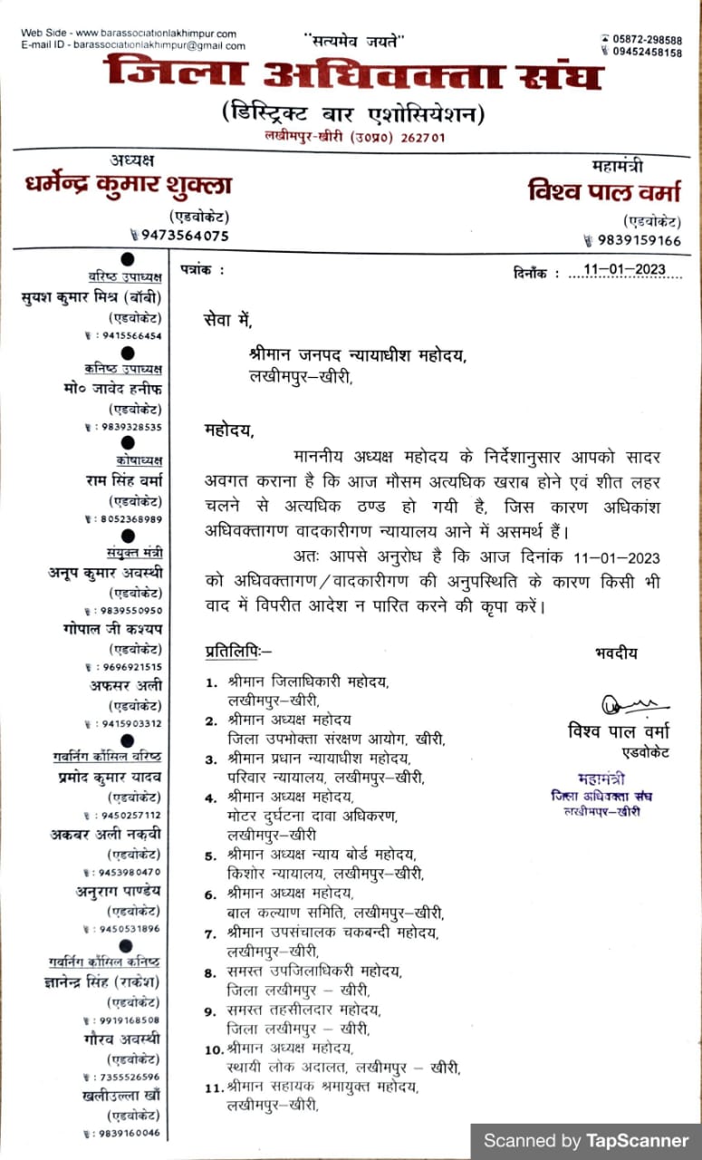 दिनांक 11.01.2023 को मौसम खराब, शीत लहर चलने हेतु किसी भी वाद में विपरीत आदेश न पारित करने हेतु।