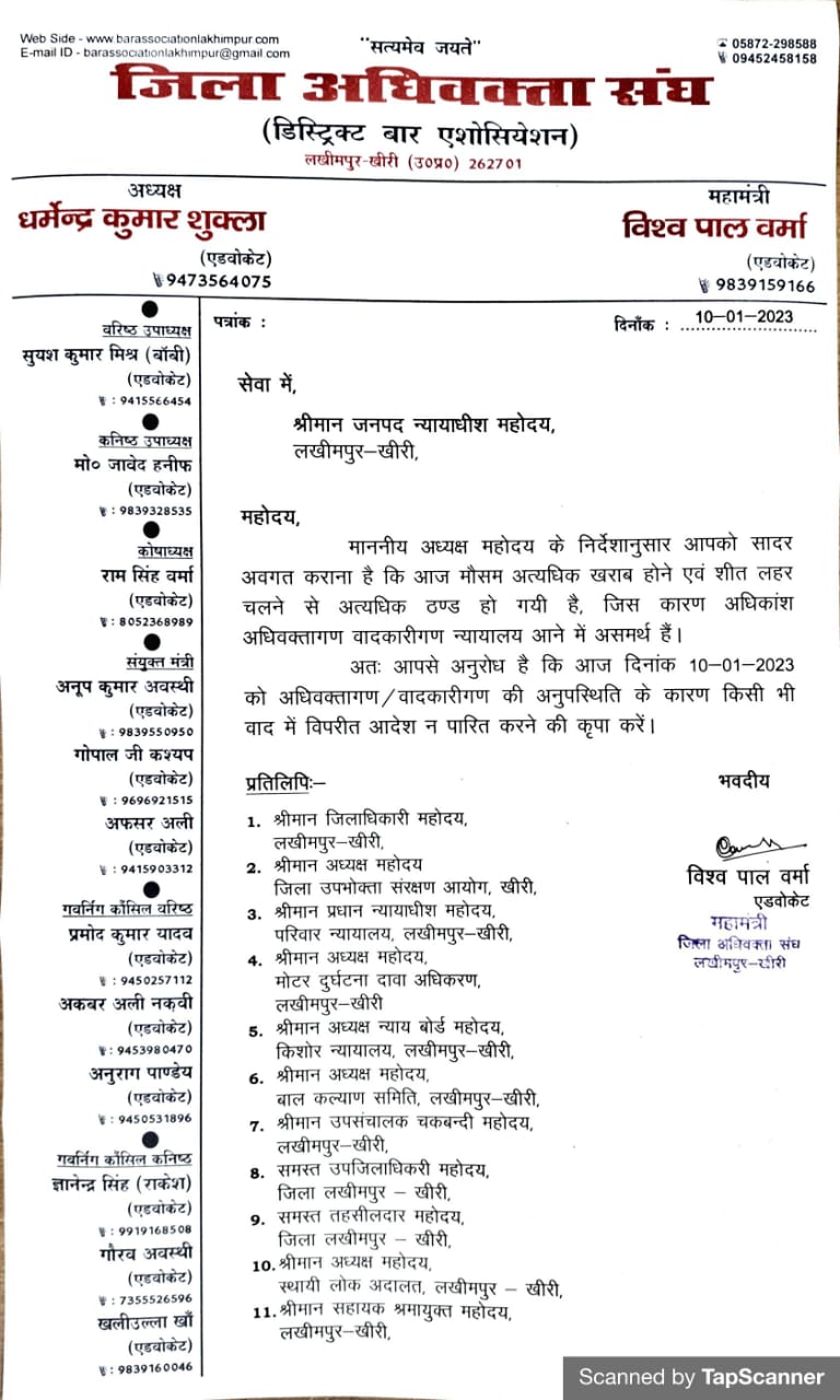 दिनांक 10.01.2023 को मौसम खराब, शीत लहर चलने हेतु किसी भी वाद में विपरीत आदेश न पारित करने हेतु।
