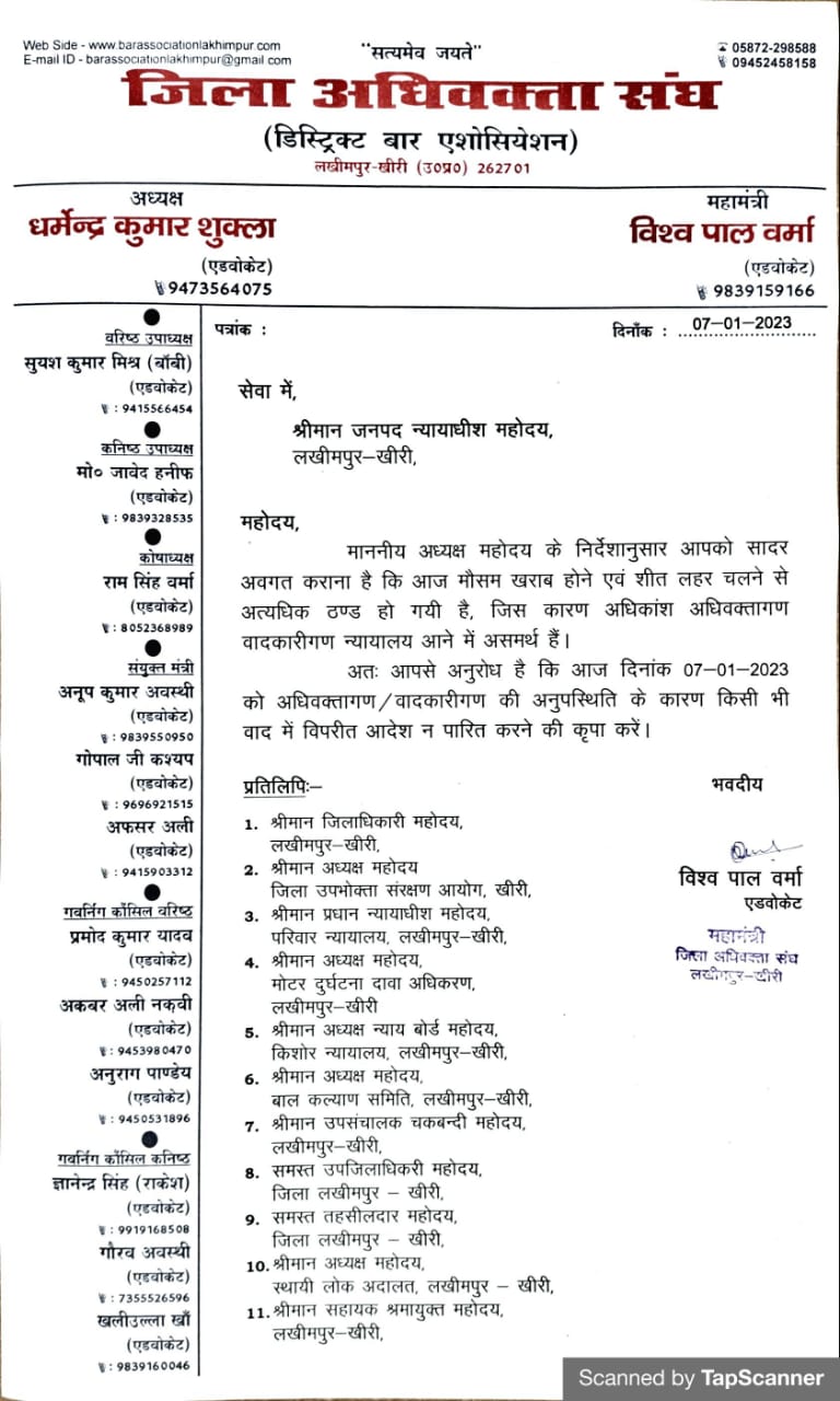 दिनांक 07.01.2023 को मौसम खराब, शीत लहर चलने हेतु किसी भी वाद में विपरीत आदेश न पारित करने हेतु।