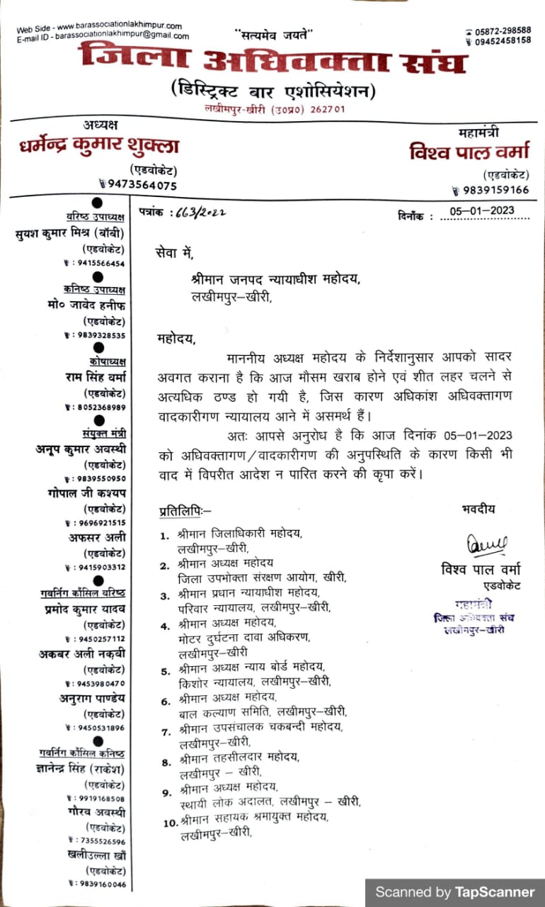 दिनांक 05.01.2023 को मौसम खराब, शीत लहर चलने हेतु किसी भी वाद में विपरीत आदेश न पारित करने हेतु।