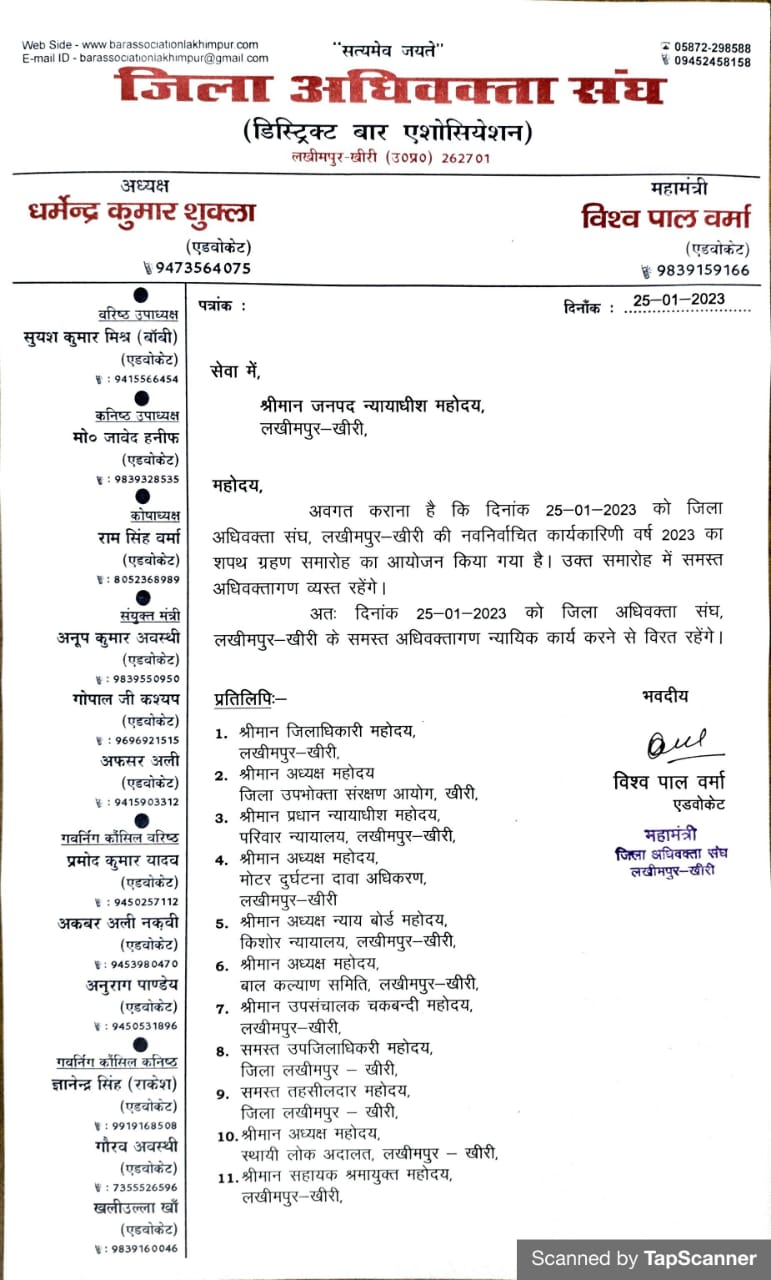 दिनांक 25.01.2023 को नव निर्वाचित कार्यकारिण शपथ ग्रहण हेतु न्यायिक कार्य से विरत